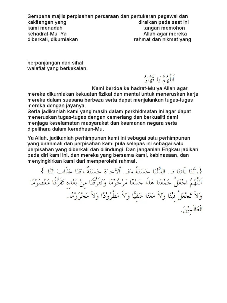 Teks bacaan doa perpisahan pegawai atasan. Berikut doa yang saya susun. Acara dilanjutkan dengan pembacaan doa oleh kasi pdad, pak agus dk.
